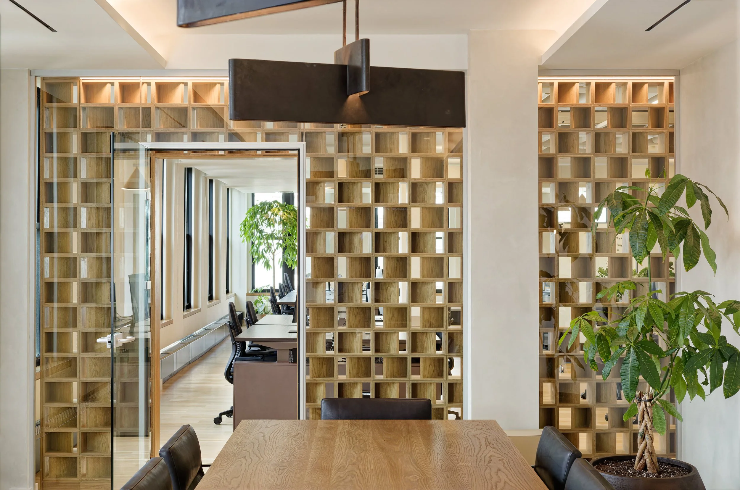 Custom-designed features include the openwork wood wall which filters light while maintaining privacy for meeting and conference areas, a double-sided moss wall separating reception from the main workspace, hand-chiseled naguri-style wood cabinetry, a raked concrete reception desk, and wood + concrete conference tables. The meditation room's color-shifting light wall - inspired by the work of James Turrell - reinforces the project's calming undercurrent.